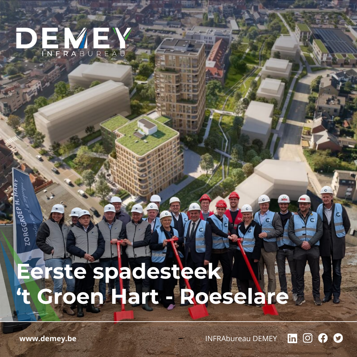 Vandaag vond de eerste spadesteek plaats van de nieuwe wijk ’t Groen Hart op de site van het voormalige Heilig Hart-ziekenhuis te Roeselare. INFRAbureau DEMEY stond samen met West8 in voor de uitwerking van het inrichtingsplan om deze site van 3 ha om te bouwen naar een park waar de functies wonen en zorg met elkaar verstrengeld worden. Het was een heuse uitdaging om de infrapuzzel te leggen met allerlei knelpunten zoals het tracé van de ingekokerde Collievijverbeek of het Mirom-warmtenet. We danken onze partners Coussee Bouw&project en ION projects voor het vertrouwen en kijken uit naar een vlot realisatieproces.